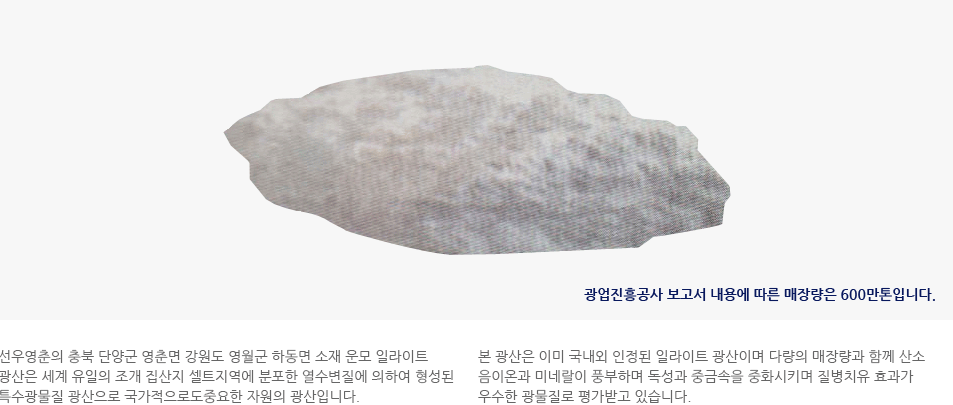 것으로 사료되며, 본 광산은 쎌트지역(조개 집산지)의 광물로써 그 결정구조가 운모와도 다르고 일라이트와도 다른 특이한 결정구를 가졌음으로 새로운 이름이