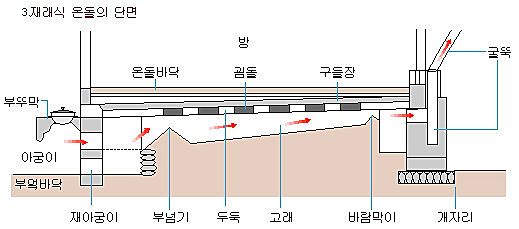 온돌은 아궁이에서 장작이나 짚등을 연소시켜 그 연소 공기를 바닥 밑으로 보내어 연료와 굴뚝을 통해 외기로 배출시켜서 바닥전체를 따뜻하게 하는 복사 난방의 일종으로 온돌은 아침, 저녁 아궁이에 불을 지펴 구들을 데워두고 그 축열에 의해 일정시간 지속적으로 사용하는 것이 일반적이다.
